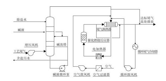 首先,有機(jī)廢氣在增壓風(fēng)機(jī)的作用下進(jìn)入堿洗塔,利用堿液脫除廢氣中的氯化物、硫化物等對(duì)催化燃燒催化劑有毒的物質(zhì)。堿洗塔上部設(shè)置水洗段,以除去廢氣中攜帶的堿液。