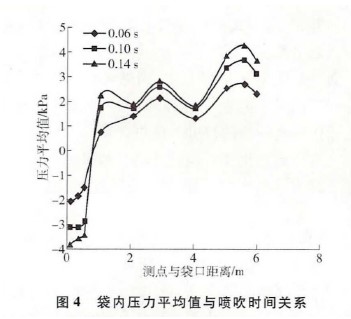 脈沖除塵器脈沖閥的噴吹時(shí)間越長(zhǎng),布袋除塵器的清灰效果也會(huì)越明顯。同時(shí),脈沖閥噴入布袋內(nèi)部的壓縮空氣的風(fēng)量也會(huì)越多。但是除塵器的噴吹時(shí)間如果增加到一定值后由于除塵集風(fēng)箱內(nèi)風(fēng)量等的原因,除塵器清灰效果的提升就會(huì)變得不再明顯。一般情況下,布袋式除塵器脈沖閥的噴吹時(shí)間設(shè)定在0.1~0.2s之間。噴吹時(shí)間對(duì)布袋內(nèi)壓力平均值的影響如圖所示。