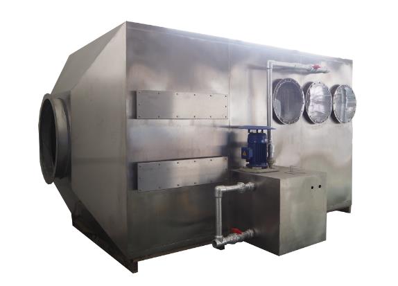 廢氣從塔底進(jìn)入塔內(nèi),氣體從底部通過(guò)填料層,然后從塔頂?shù)某隹谂懦?。水從塔的頂部和中間均勻地通過(guò)液體分配器噴射到填料層,并沿著填料層的表面流下,直到塔的底部由泵送到塔的頂部和中間以便回收。水汽和剩余的廢氣進(jìn)入脫水除霧階段,脫去液滴、霧氣。經(jīng)過(guò)初始處理后的氣體從吸收塔的上端排氣管進(jìn)入下一級(jí)處理階段或排出大氣。