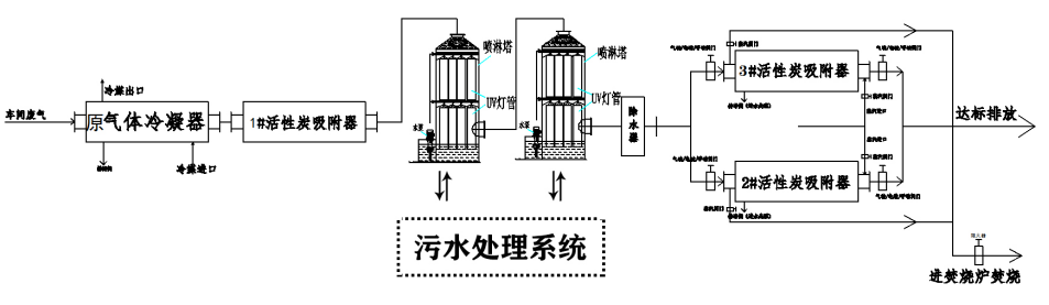 針對(duì)該工況的特殊性及復(fù)雜性,以及現(xiàn)場(chǎng)工況和客戶預(yù)算的實(shí)際情況,本方案采用活性炭吸附脫附多級(jí)治理+水霧分離器+uv光氧綜合治理的方法,示意圖如下