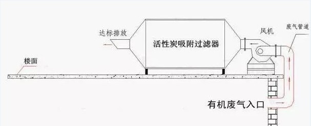 有機(jī)廢氣先通過(guò)干式過(guò)濾,將廢氣中顆粒狀污染物截留去除,然后進(jìn)入活性炭吸附床進(jìn)行吸附,利用具有大比表面積的蜂窩狀活性炭將有機(jī)溶劑吸附在活性炭表面,處理后干凈的氣流經(jīng)過(guò)風(fēng)機(jī)、煙囪高空排放。