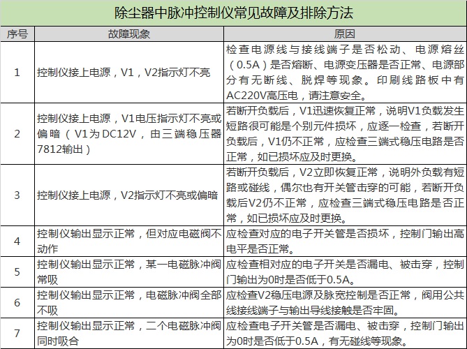 ⑧ 脈沖控制儀在使用中容易出現(xiàn)的故障及排除方法: