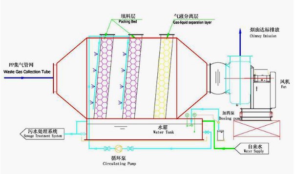 廢氣從塔底進(jìn)入塔內(nèi),氣體從底部通過(guò)填料層,然后從塔頂?shù)某隹谂懦?。水從塔的頂部和中間均勻地通過(guò)液體分配器噴射到填料層,并沿著填料層的表面流下,直到塔的底部由泵送到塔的頂部和中間以便回收。水汽和剩余的廢氣進(jìn)入脫水除霧階段,脫去液滴、霧氣。經(jīng)過(guò)初始處理后的氣體從吸收塔的上端排氣管進(jìn)入下一級(jí)處理階段或排出大氣。